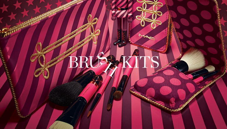 Four bespoke M·A·C brush kits – Essential, Mineralize, Basic and Contour – for a wonderland of looks at your fingertips. All with fuchsia handles and gold accents in a matching fuchsia- and burgundy-striped pouch.