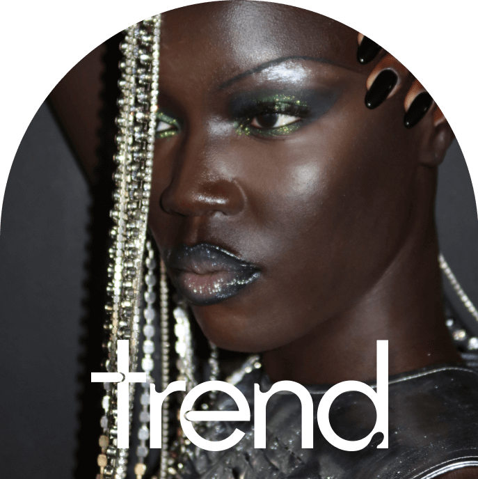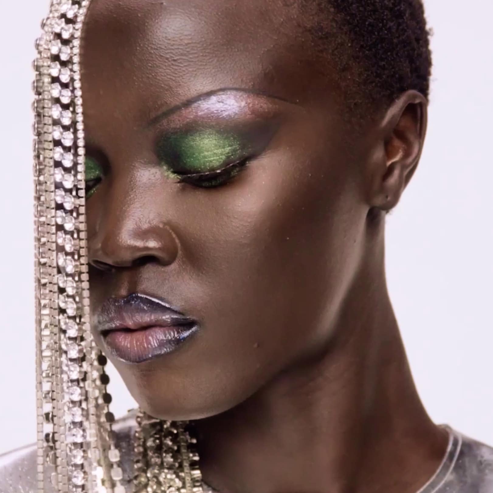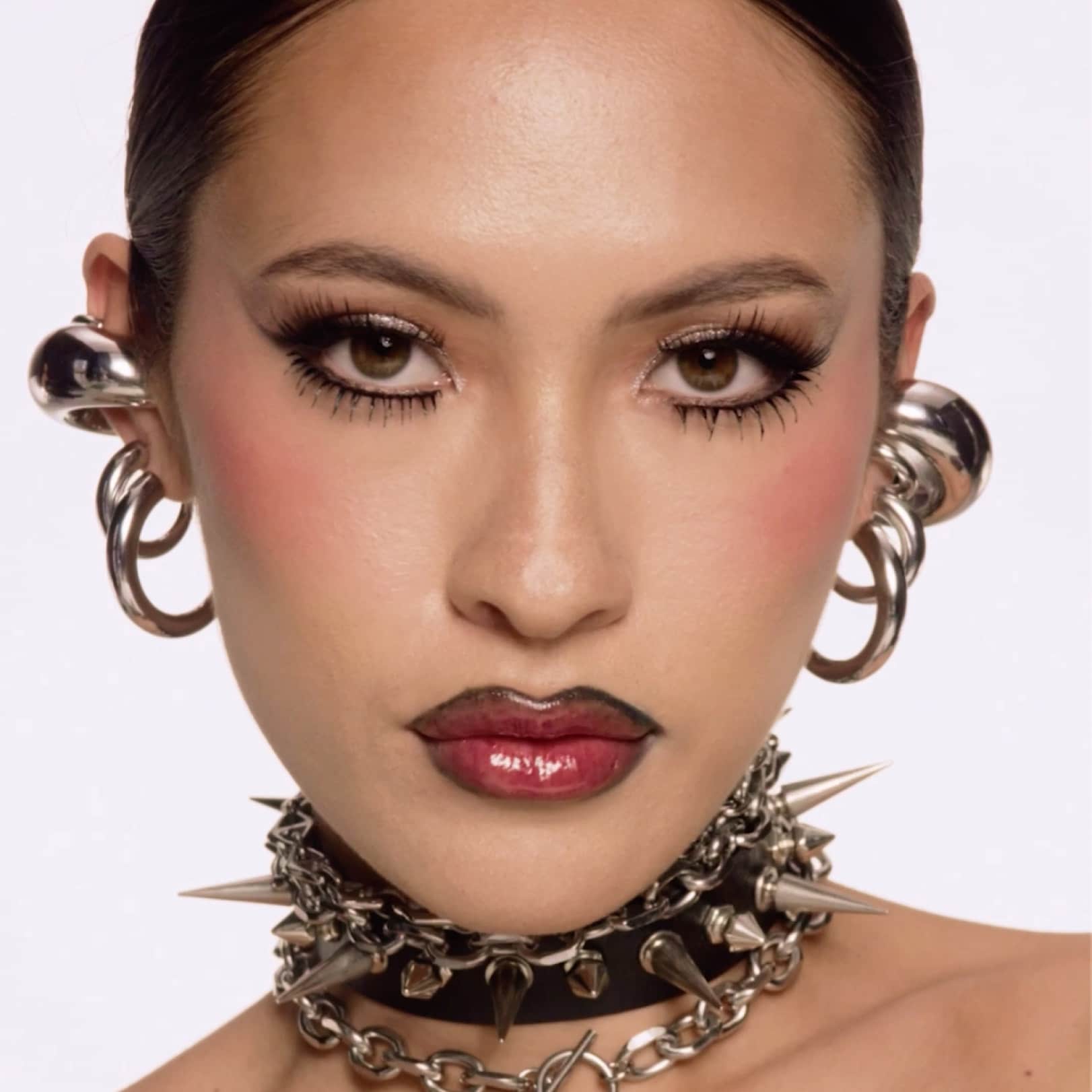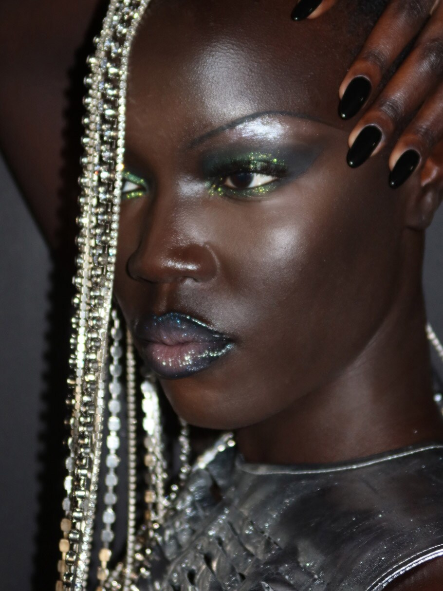 Y2K meets Y3K with this futuristic look that fuses glossy, mirror-like lips with ultra-reflective eye makeup.