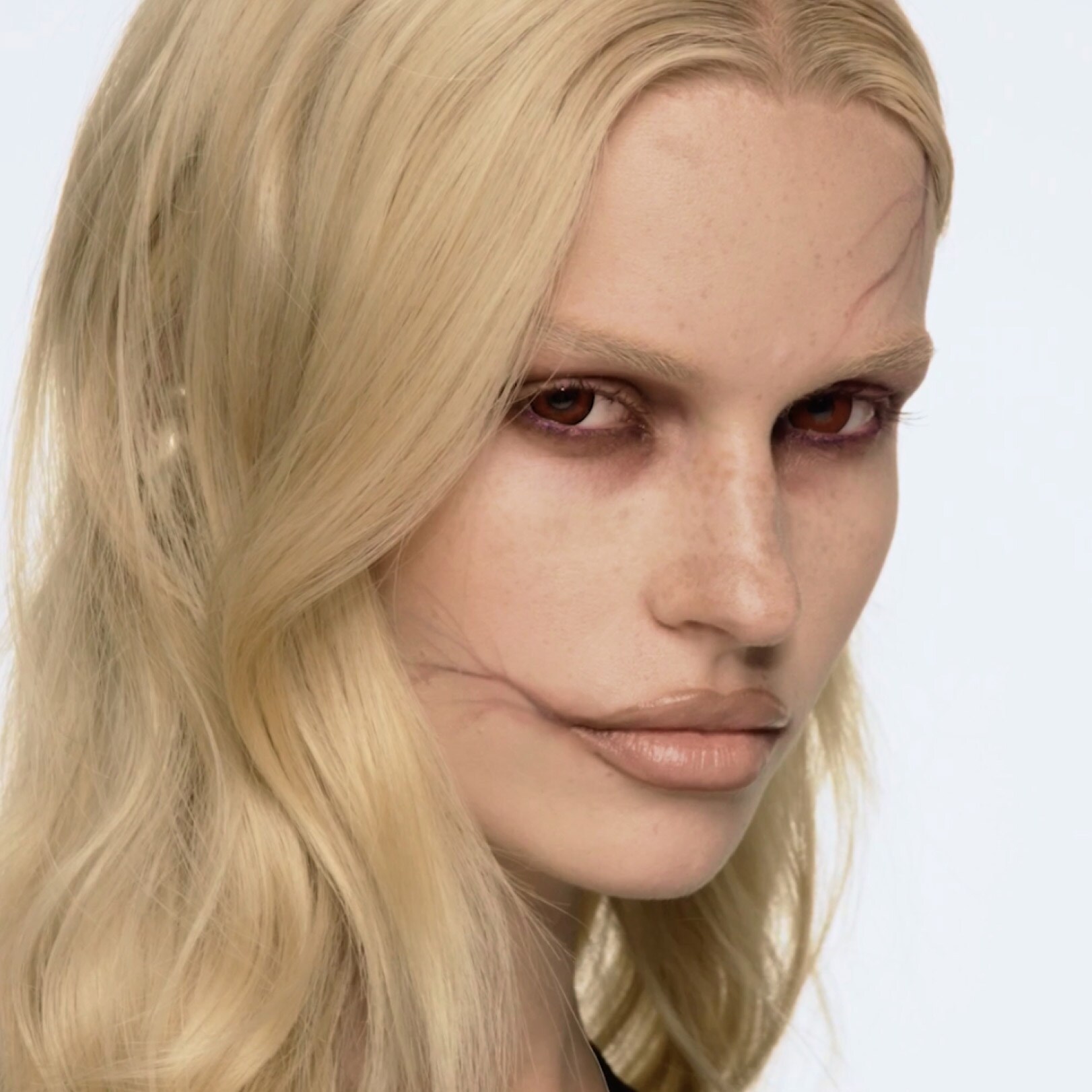 - Mix shades from the Connect In Colour Eye Shadow Palette: Encrypted Kryptonite and Future Flame to draw faux veins using a 263S Brush. Use the same shades to create a black-and-blue effect on the eyes.