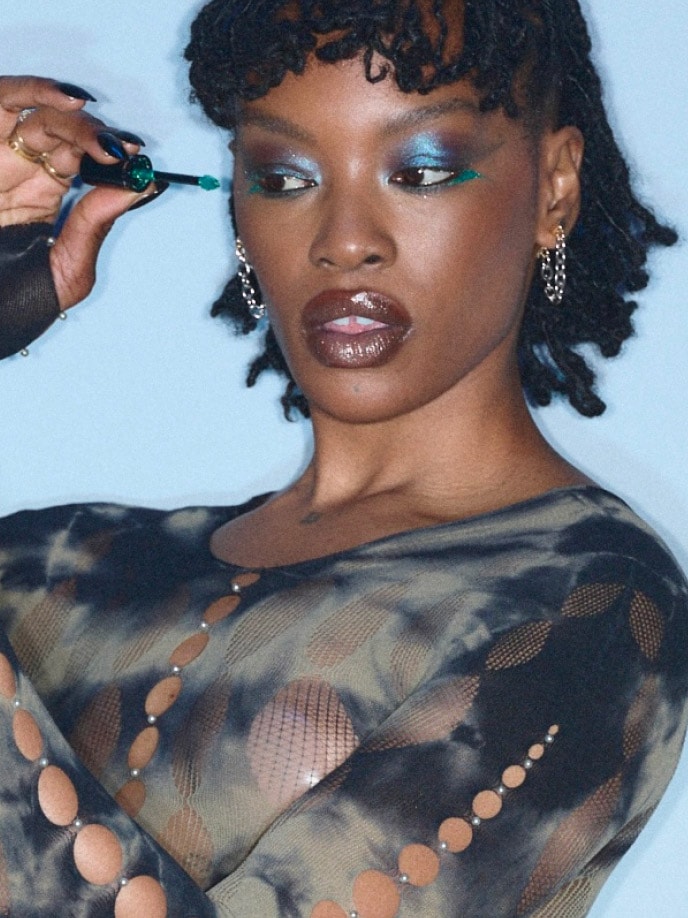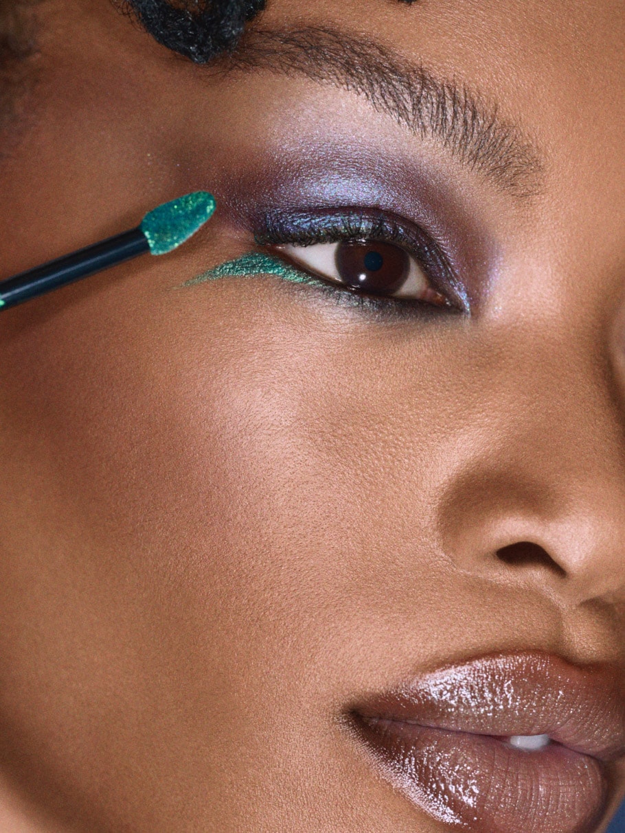 A teal chrome gaze and glossy mirrored lips give this Y3K look back-to-the-future energy.